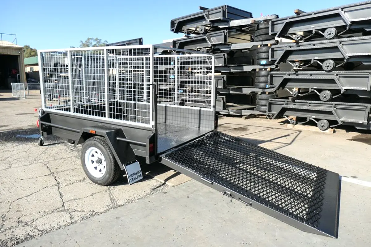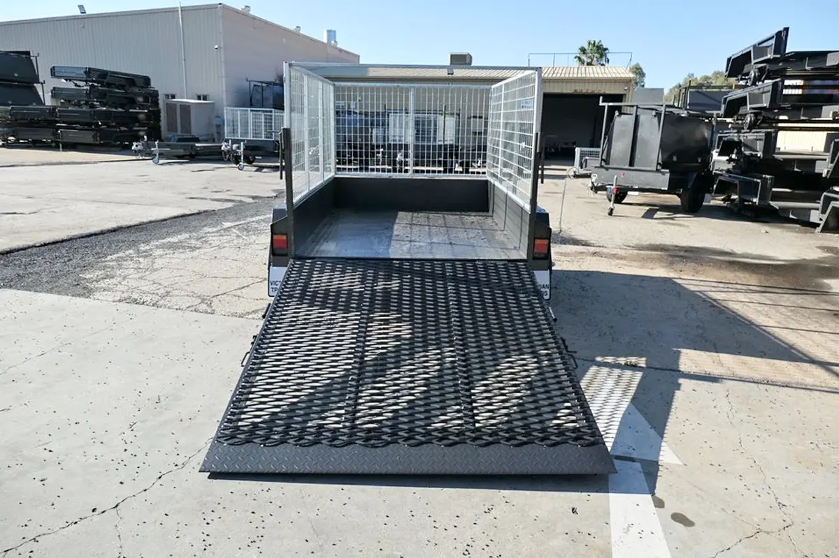 7×5 Single Axle Commercial Heavy Duty Cage Trailer with 3 Ft Cage, 5ft Grid Mesh Drop Down Rear Ramp (spring assisted) | 1000 KG GVM – Checker Plate Floor – Drop Front for Sale in Thomastown, Melbourne Victoria. Trailer & Trailers has a range of Cage Trailers for Sale  in Victoria’s Largest Trailer Warehouse in Thomastown.